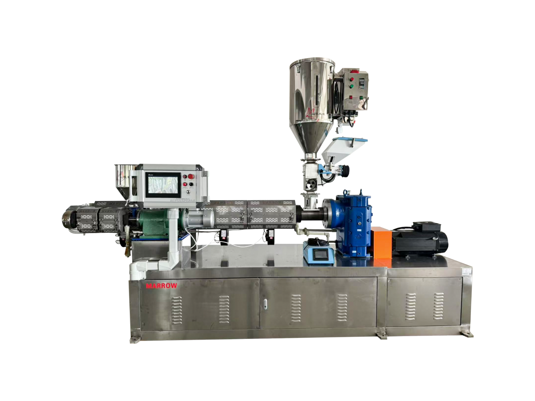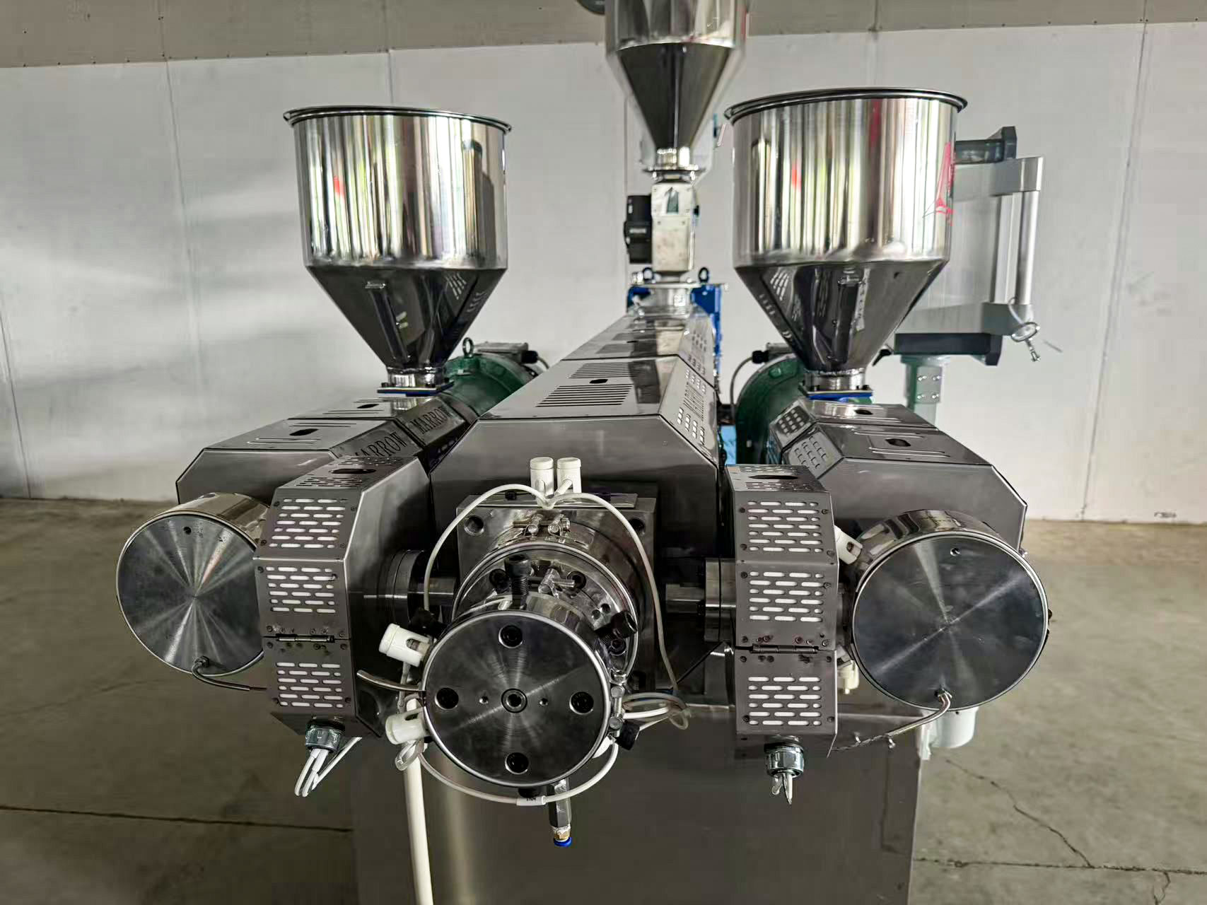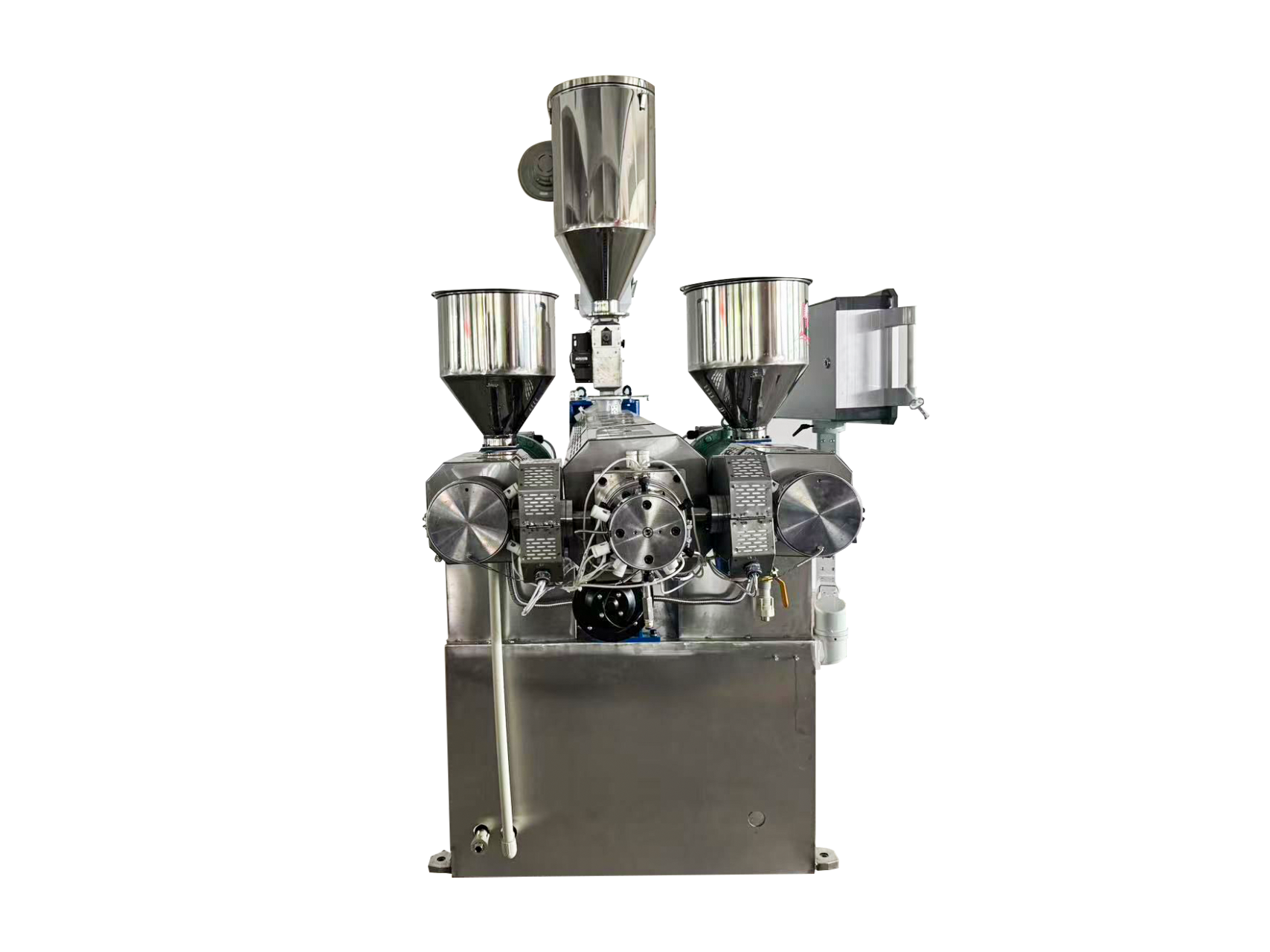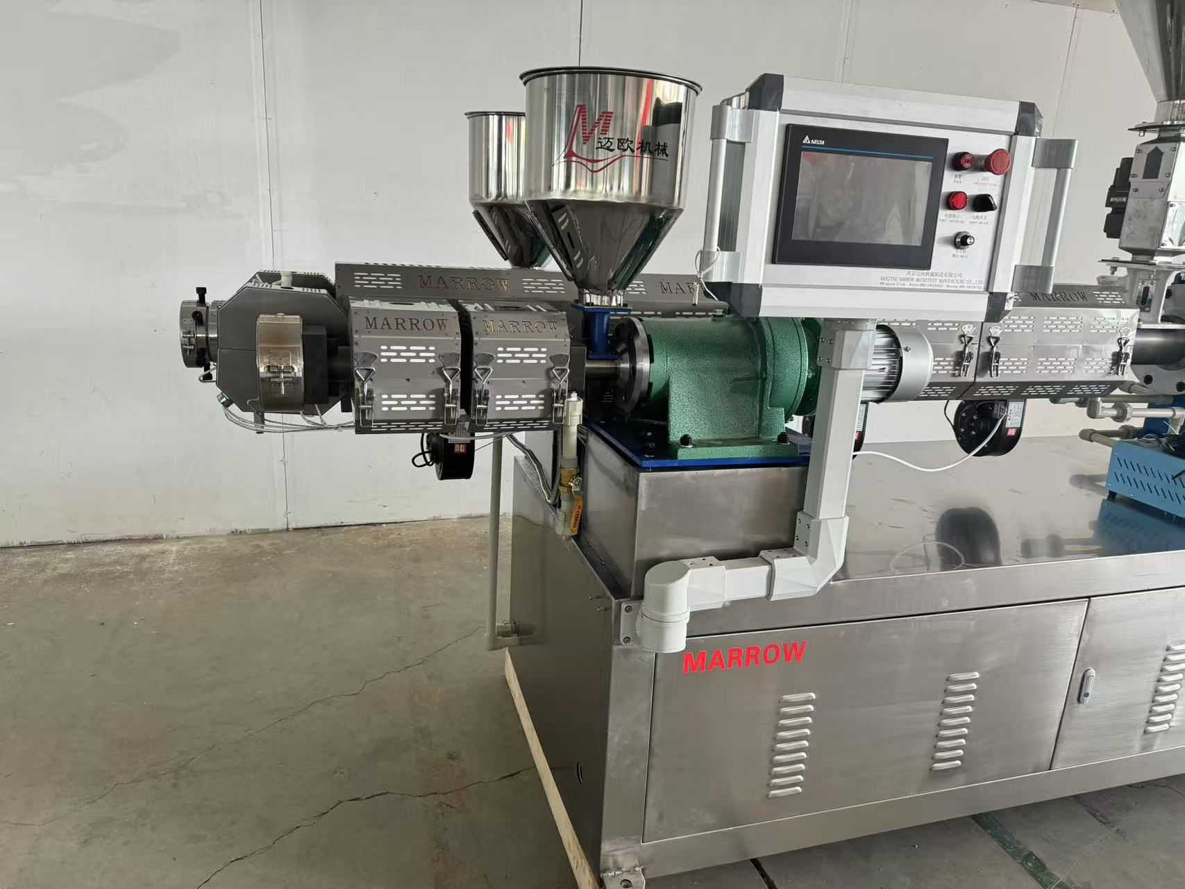 ML13-65 PLA/PLC 三色吸管擠出機組由:擠出機、機頭、冷卻定型裝置、牽引切割裝置、理管輸送裝置(選配)等部分組成,可實現:單色擠出,多色共擠等多種配置。采用全新BM分離型參數設計的PLA料專用65mm直徑螺桿:長徑比33:1,塑化效果好,擠出量大,出膠穩定;采用173型硬齒面齒輪箱,30kw高效節能同步伺服電機,塑化效果好,擠出量大,出膠穩定;是生產PLA材料飲料吸管的專業設備,也可以滿足普通PP料吸管的生產。
